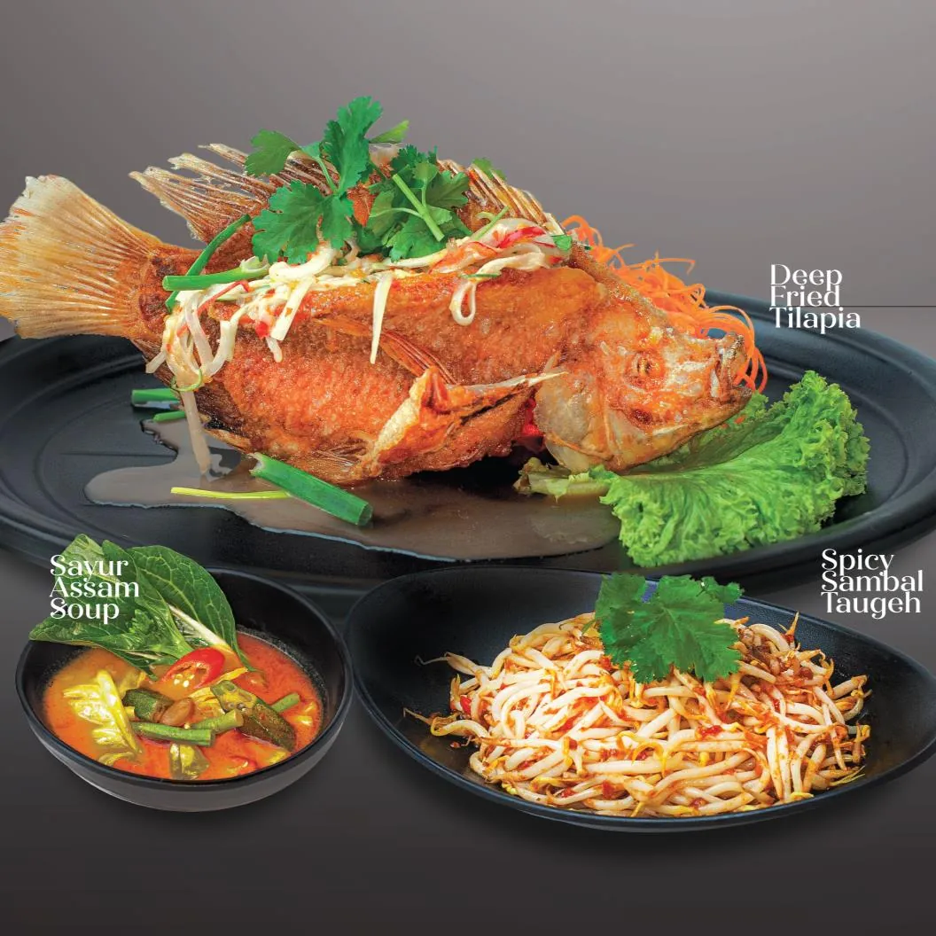 Deep Fried Tilapia Sayur Assam Soup Spicy Sambal Taugeh (Beansprouts)