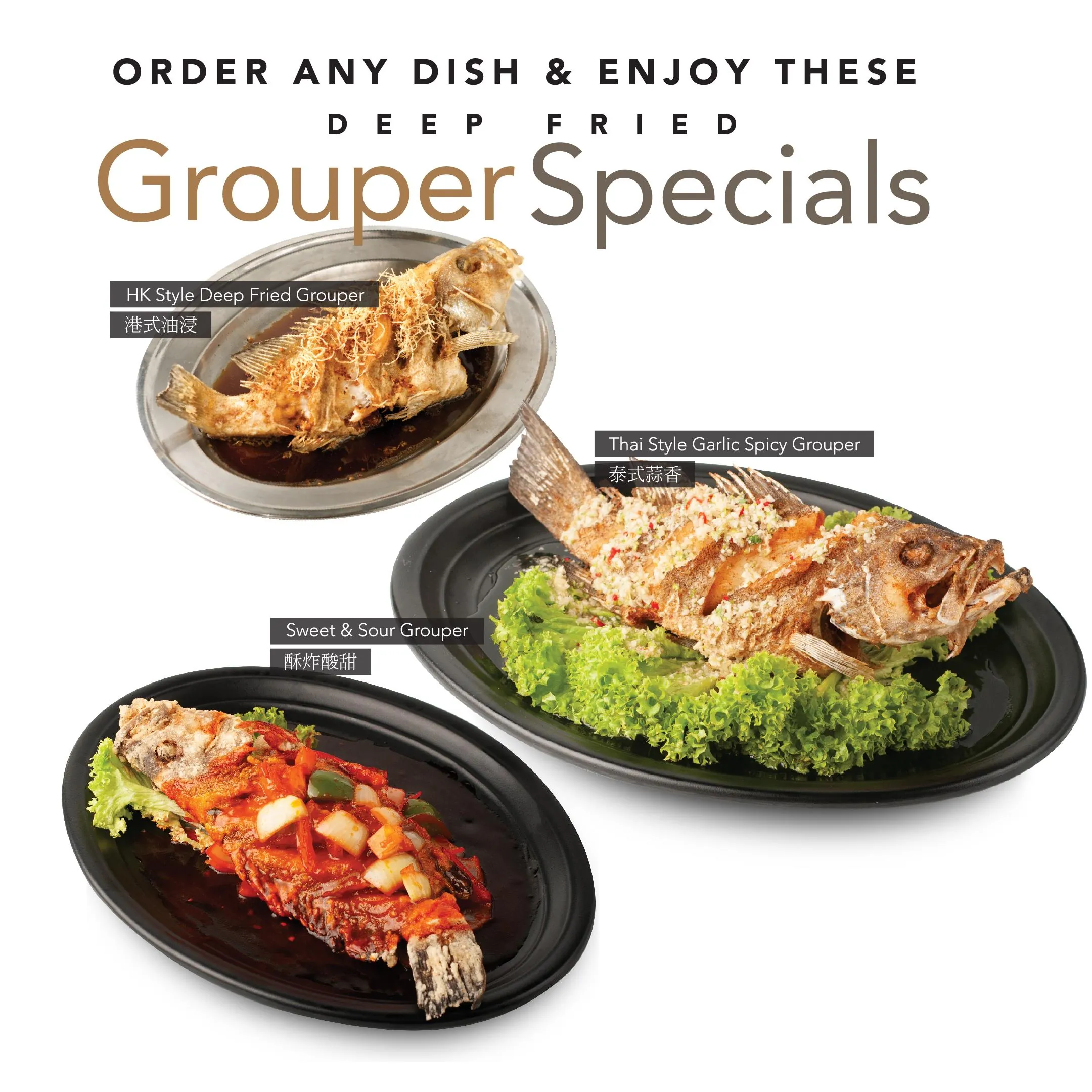 Set A — (Serves 6–8 Guests) 1. Double Treasure Soup with Dried Scallop & Crabmeat 鲜美干贝蟹肉羹 2. Hong Kong Style Steamed Seabass 港蒸金目鲈 3. Crispy Salt & Pepper Prawns 椒盐虾 4. Luo Han Zhai – Vegetarian Delight with Broccoli & Assorted Mushrooms 罗汉斋 5. Fragrant Golden Chicken 甘香鸡 6. Golden Fried Rice 黄金炒饭 7. Braised Beancurd in Claypot 砂煲豆腐 8. Chef’s Dessert of the Day 精美甜品